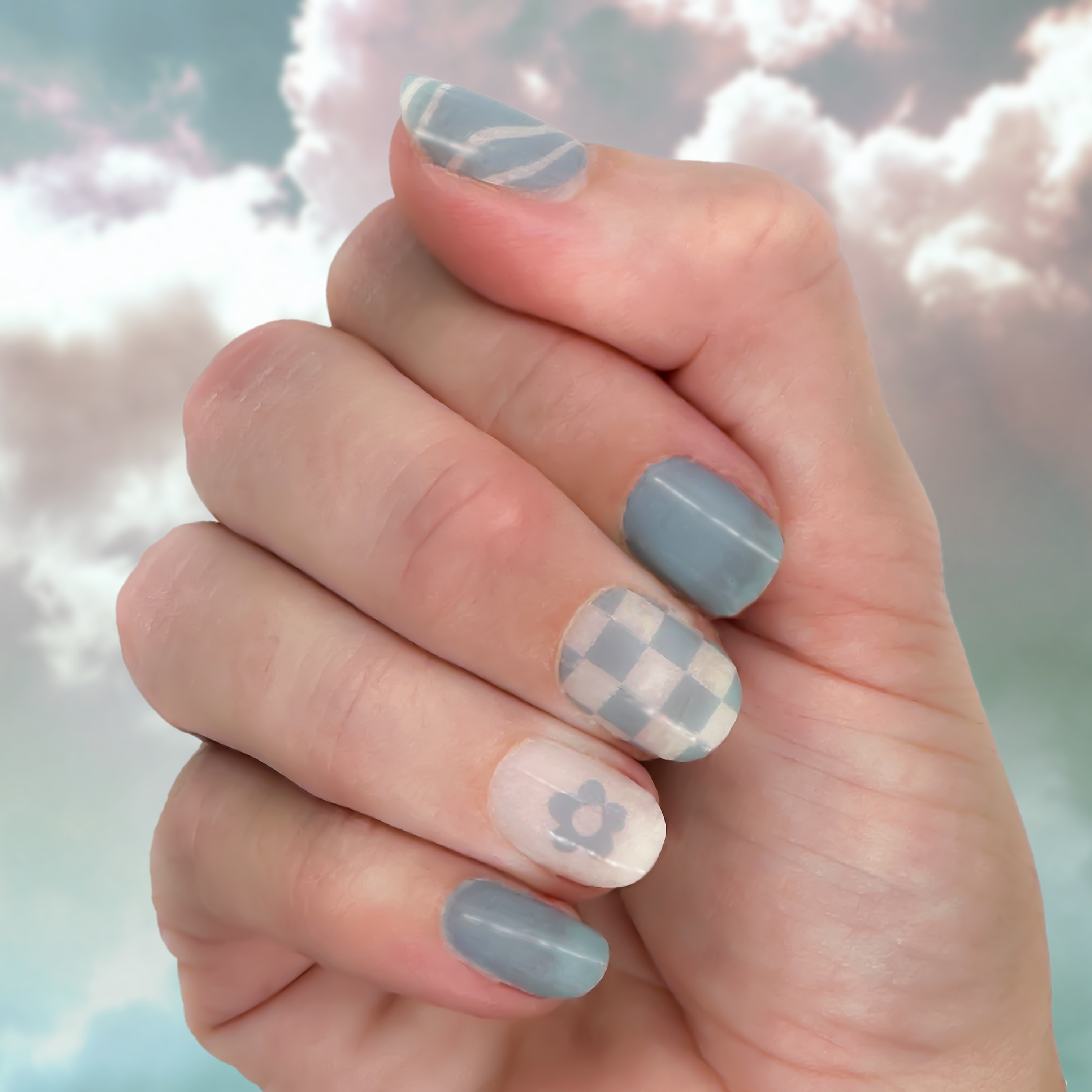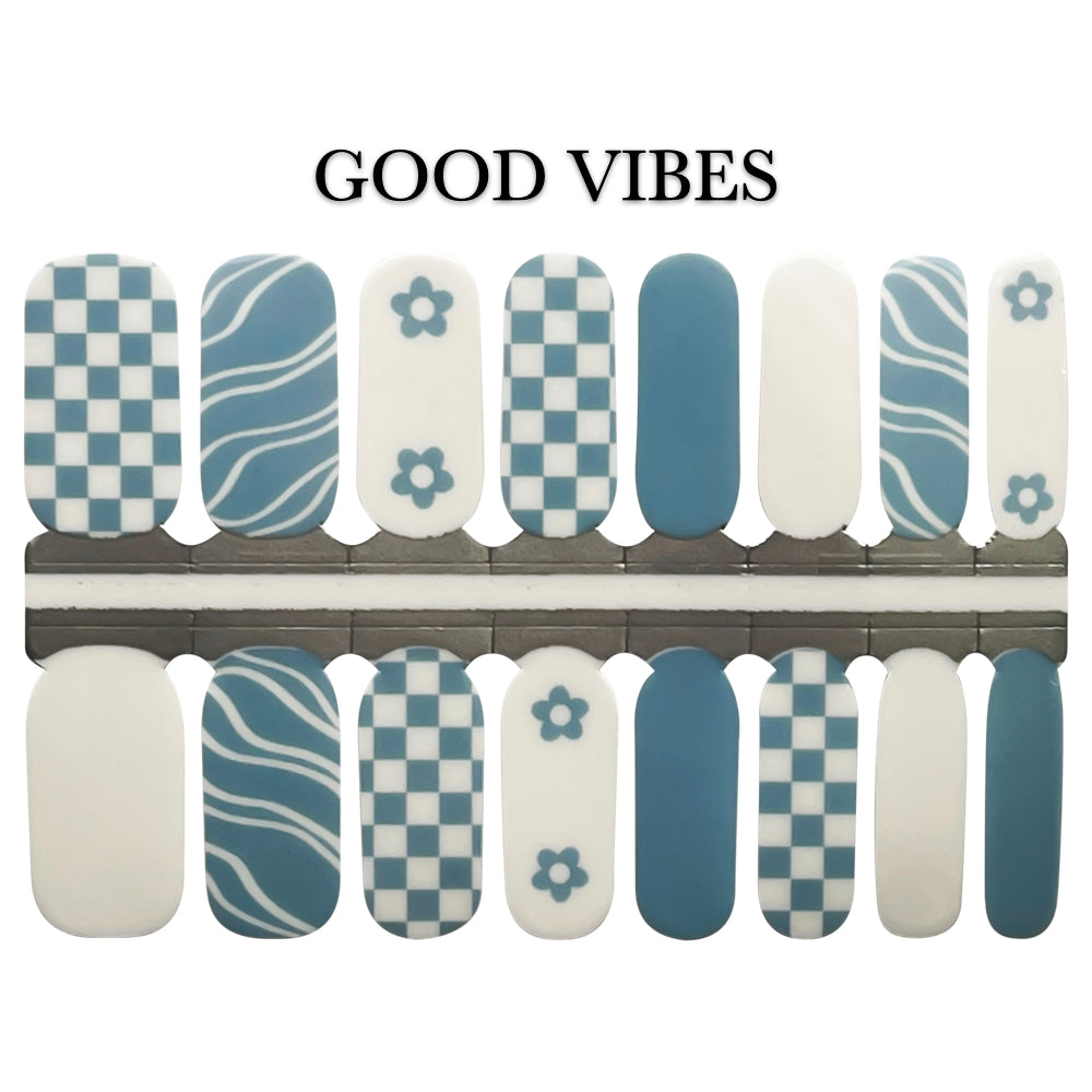 Add some funky flair to your nails with our Nail Wrap- Good Vibes! These semi-transparent wraps feature retro designs in light blue and white. Bring on the good vibes and show off your playful side with every manicure.