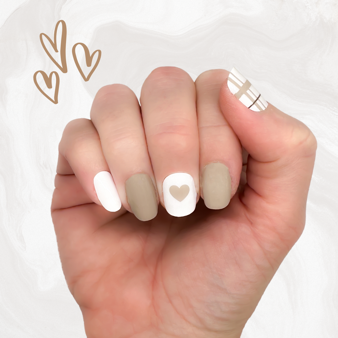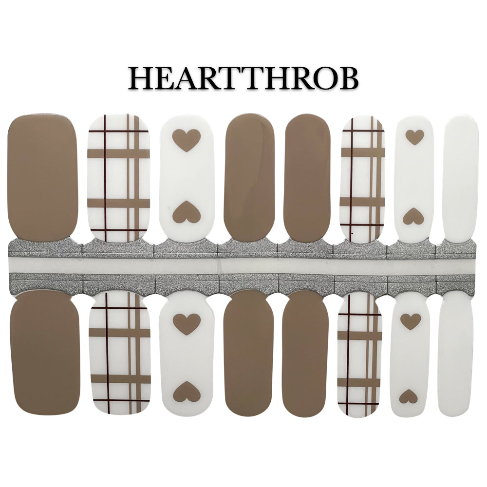 Get ready to steal some hearts with our Nail Wrap - Heart Throb! These tan and white nail wraps feature a playful plaid design with adorable tan hearts, perfect for adding some fun and flair to your nails.