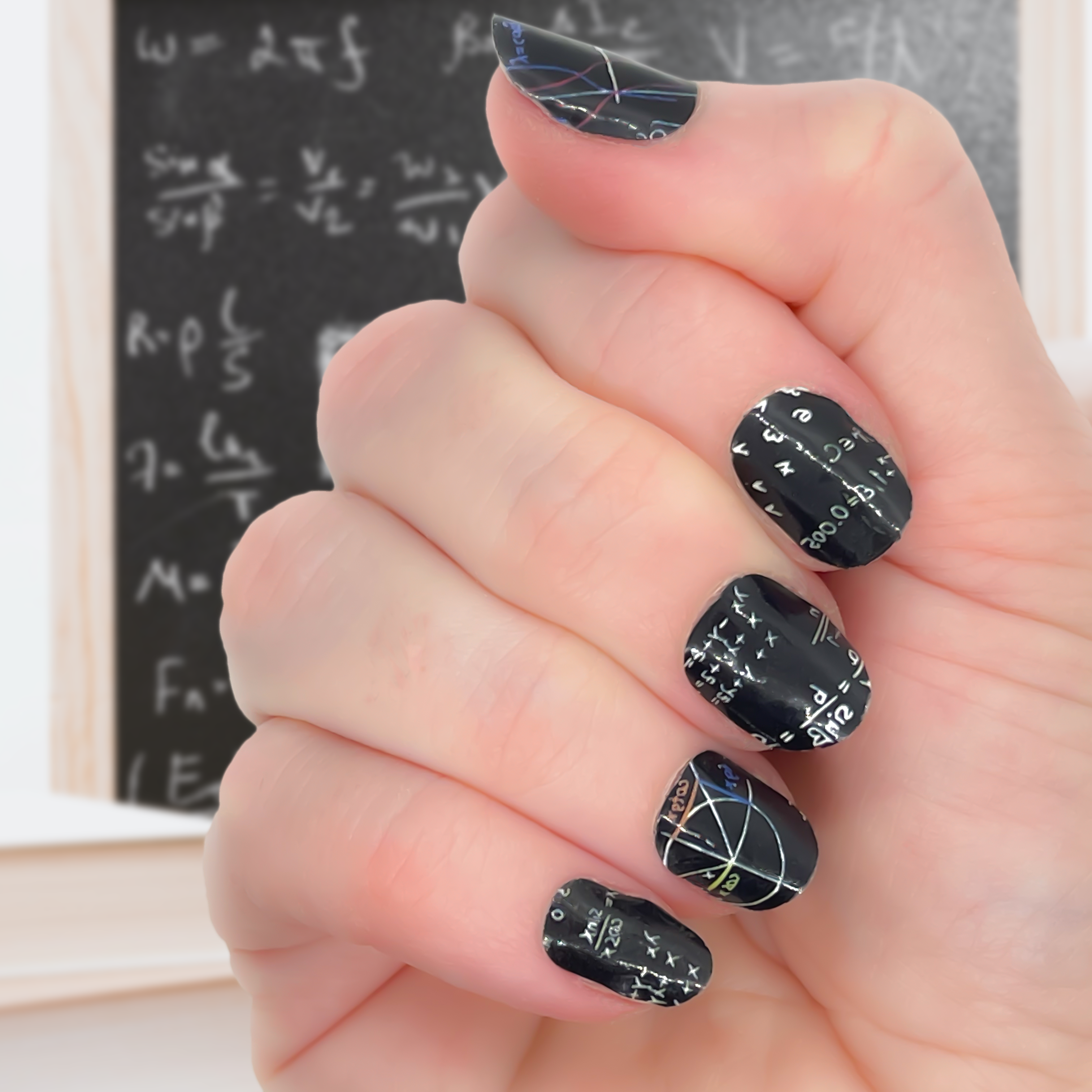 These black nail wraps feature a stylish math equation design, giving you a unique and edgy look. Perfect for teachers or anyone who loves math. Show off your love for numbers and fashion with these nail wraps!