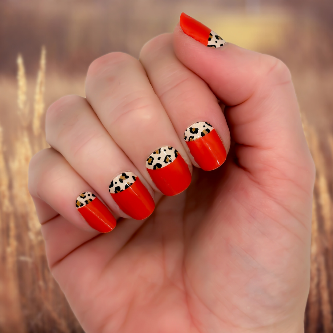 These bold red wraps feature a fierce leopard print at the base, adding a touch of wildness to your manicure. Complete your look and get ready to roar with these fun and playful nail wraps!