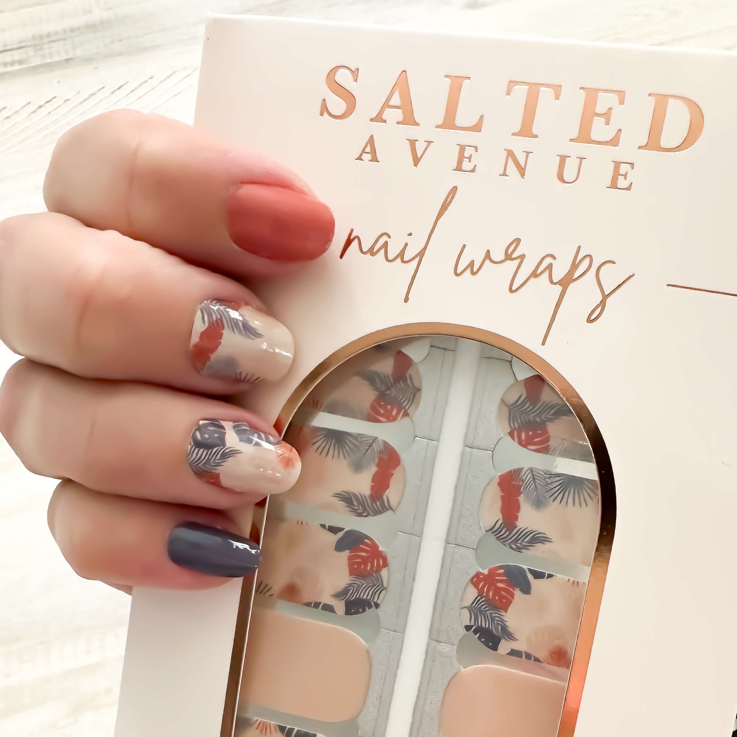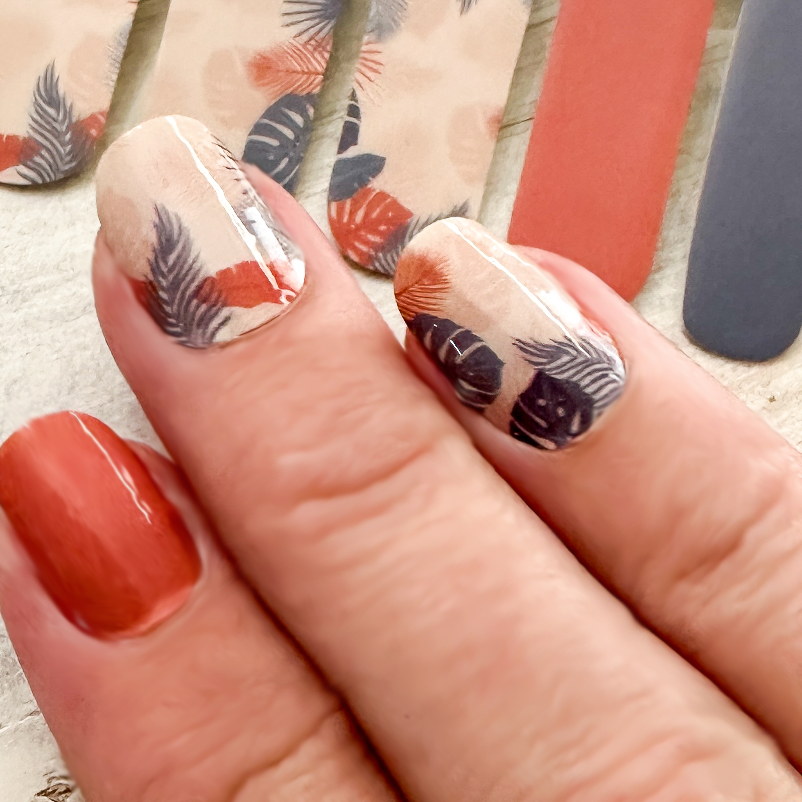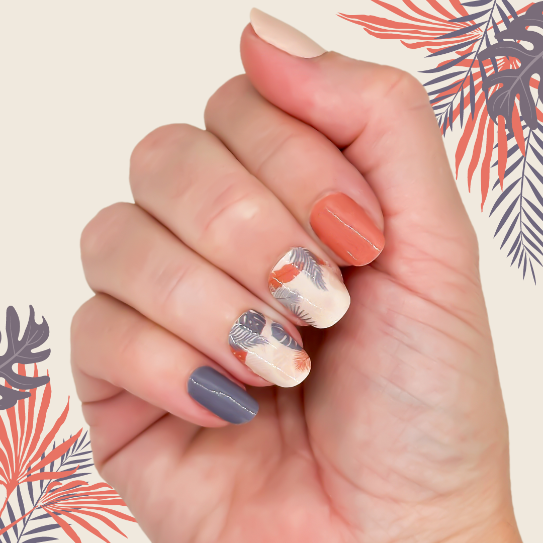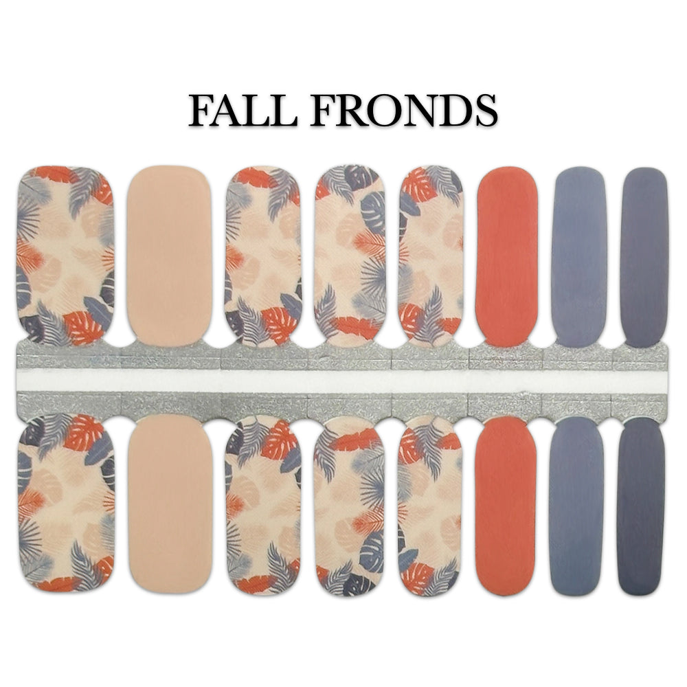 Fall Fronds features beige, burnt orange and grey blue frond leaves, these nails will elevate your look and give you a touch of seasonal charm.