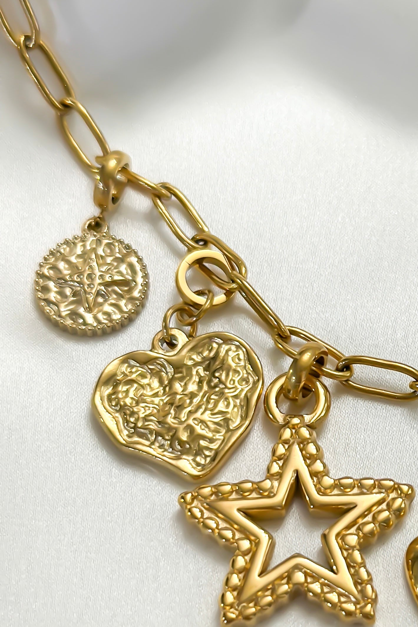 A modern take on a classic symbol, this charm features a heart shape with a textured hammered finish that catches the light beautifully. Bold yet understated, this charm adds a touch of artisanal elegance to any necklace.