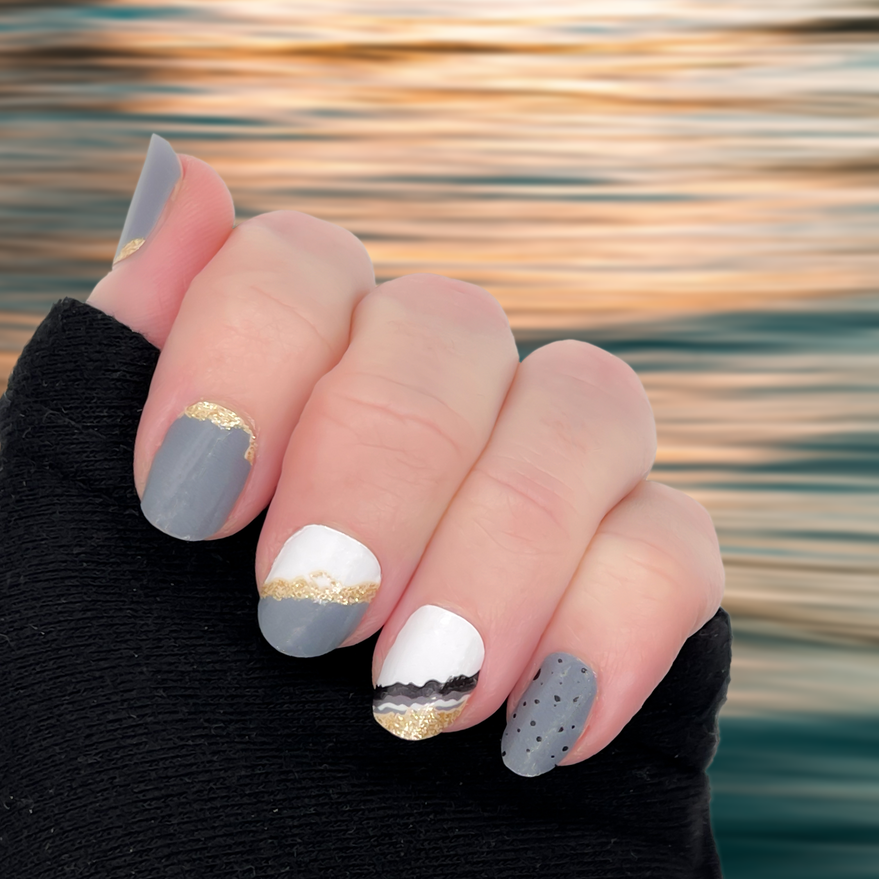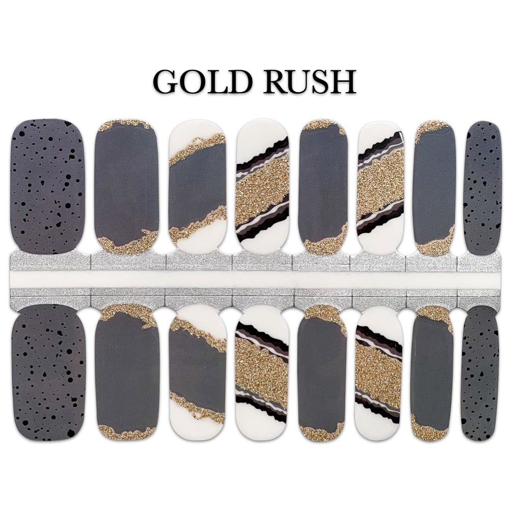 Get your nails party-ready with our Nail Wrap - Gold Rush! Featuring a unique combination of gray, gold glitter, white, and splashes of black, these wraps will add a touch of glam to any outfit. Perfect for a night out or adding some sparkle to your everyday look.