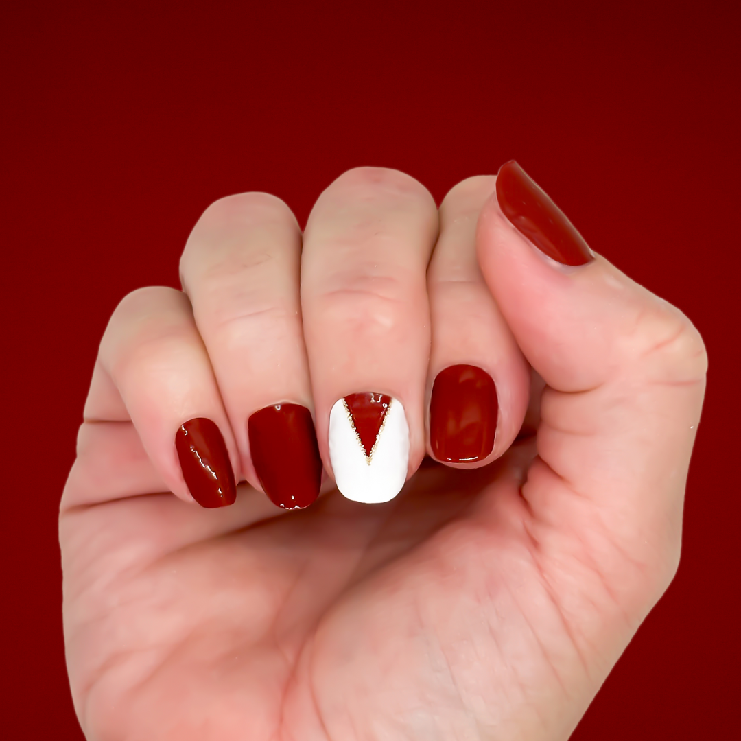 This deep burgundy shade is both elegant and versatile. And let's not forget about the classic white accent nail with a burgundy and gold decal.