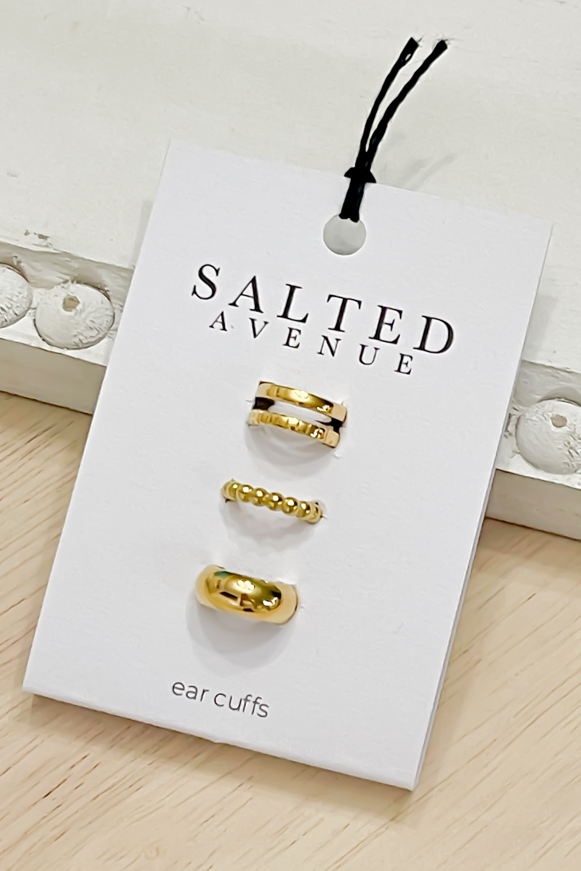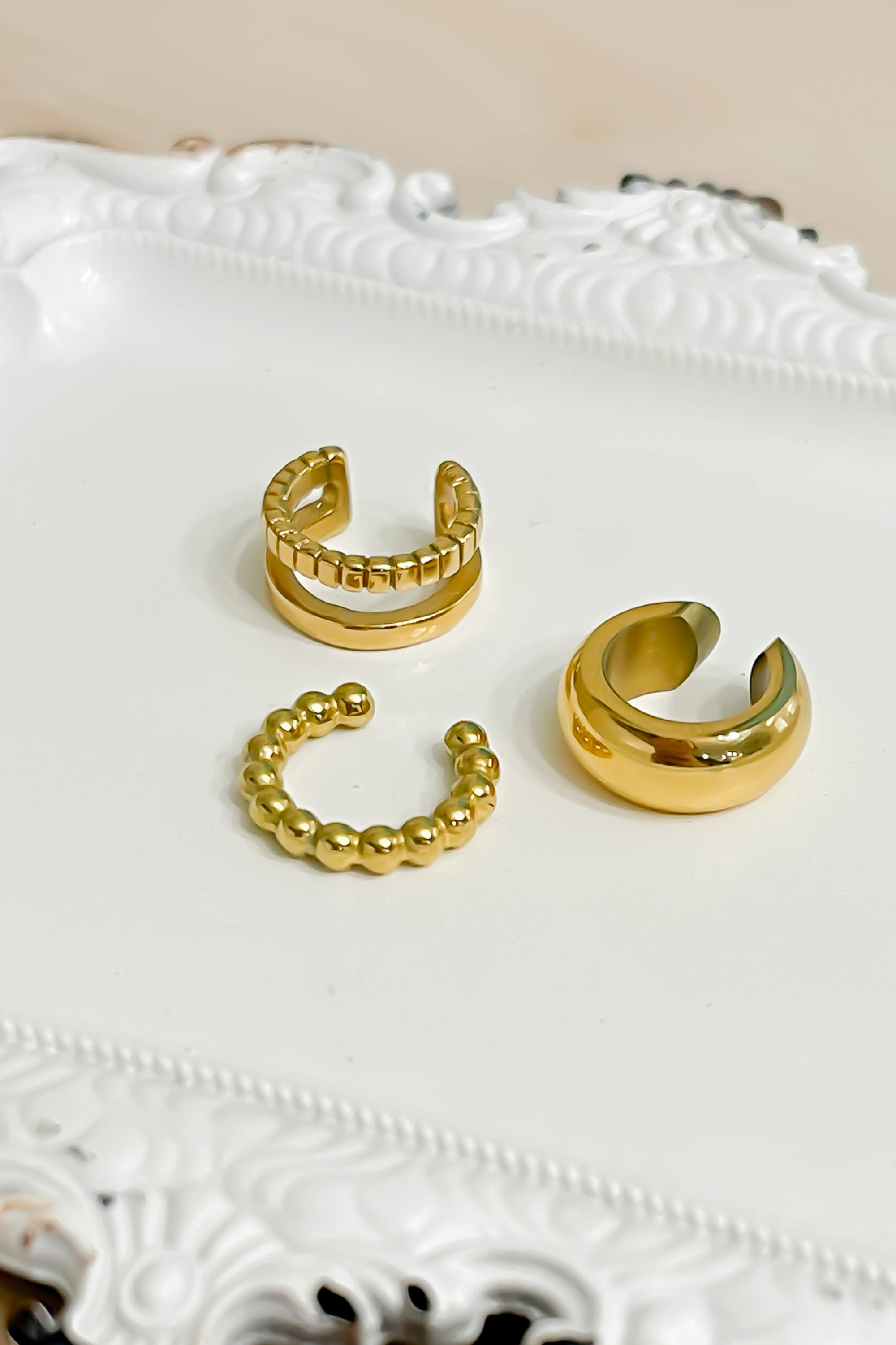 Add some effortless style to your look with our set of 3 stainless steel gold plated ear cuffs! This set includes a quadruple cuff, double cuff, and single gold hoop cuff, perfect for adding a touch of edge to your ensemble without the need for a piercing. It also makes a great gift for any fashion-forward friend!