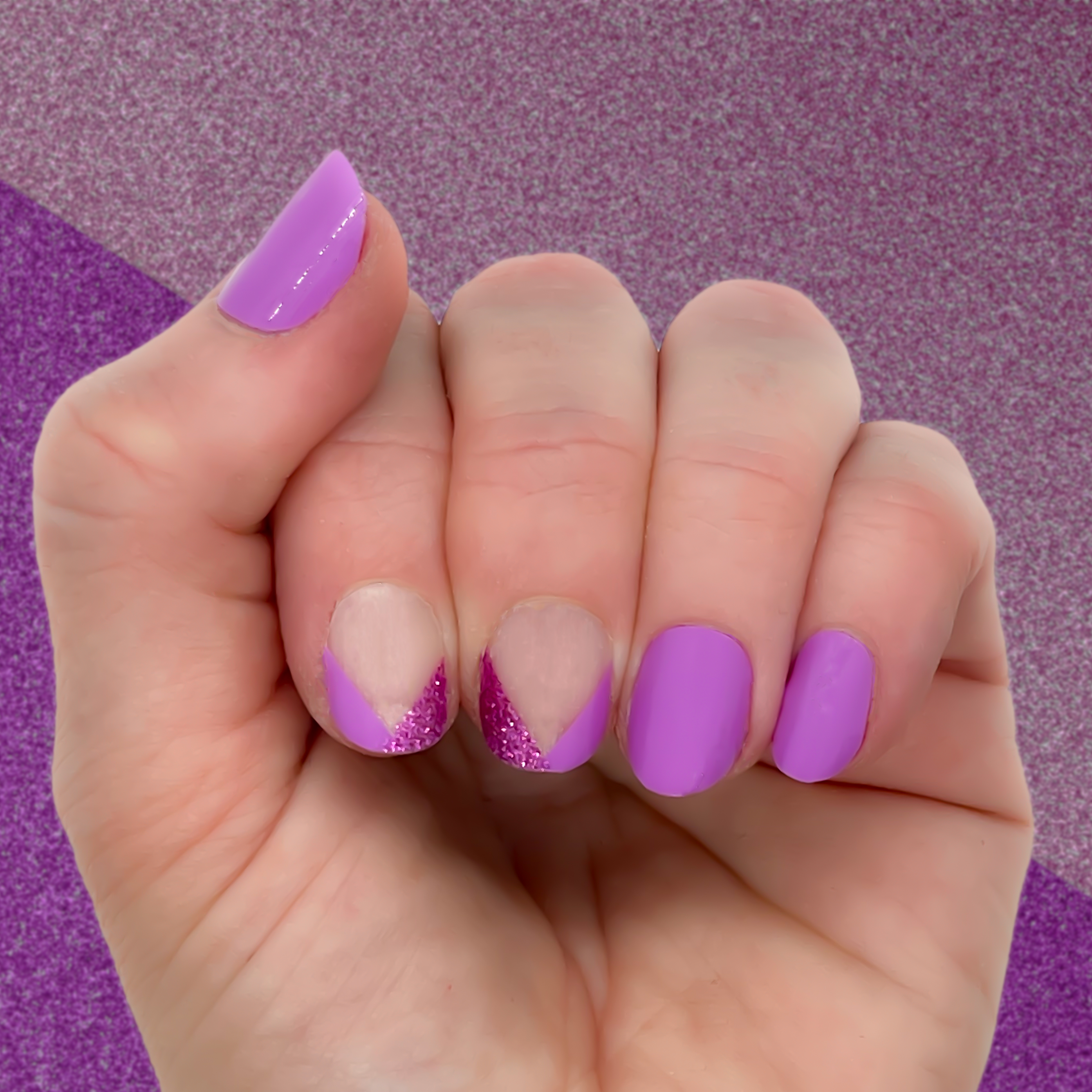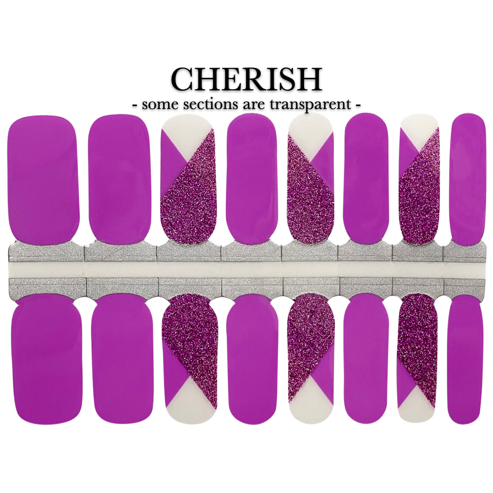 Experience the romantic vibes of our Cherish nail wrap! Let your nails sparkle and shine with this gorgeous mix of solid purple with purple sparkle and subtle transparent sections. Enjoy trendsetting nails that will transform your look and make you unforgettable.