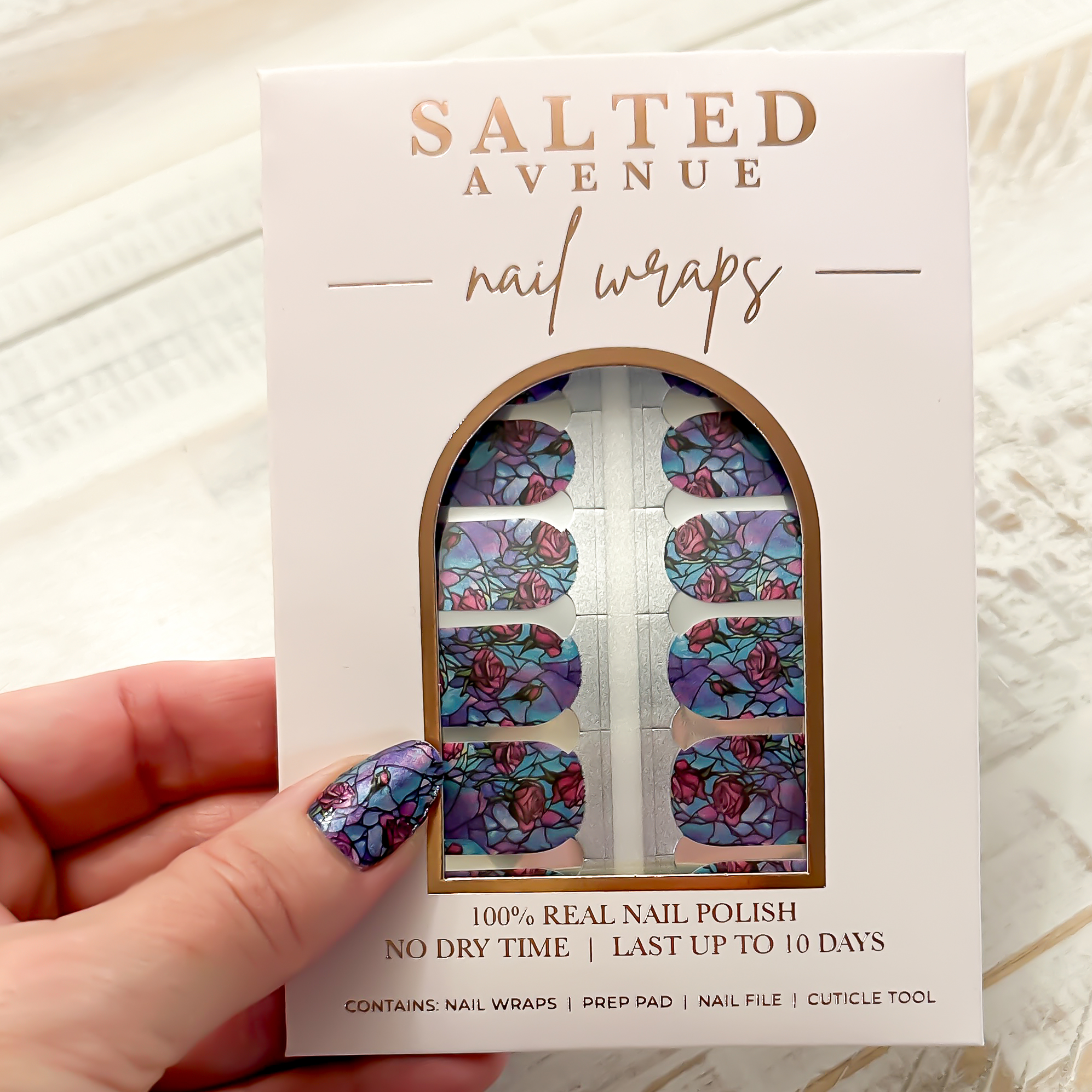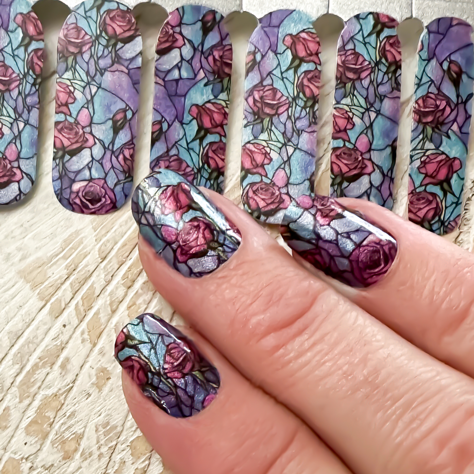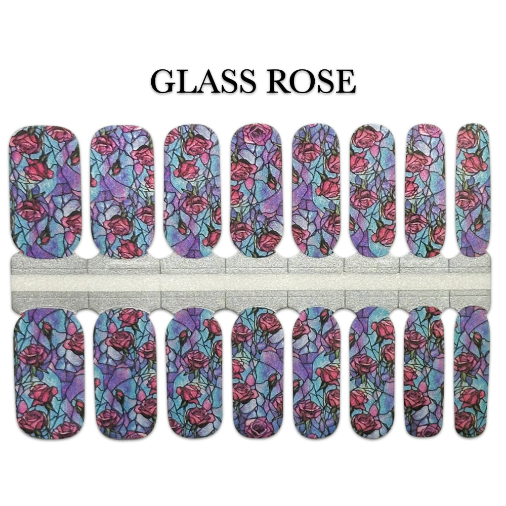Transform your nails into a work of art with our Nail Wrap. The stained glass window effect features a stunning combination of blue and purple, with a delicate rose design.