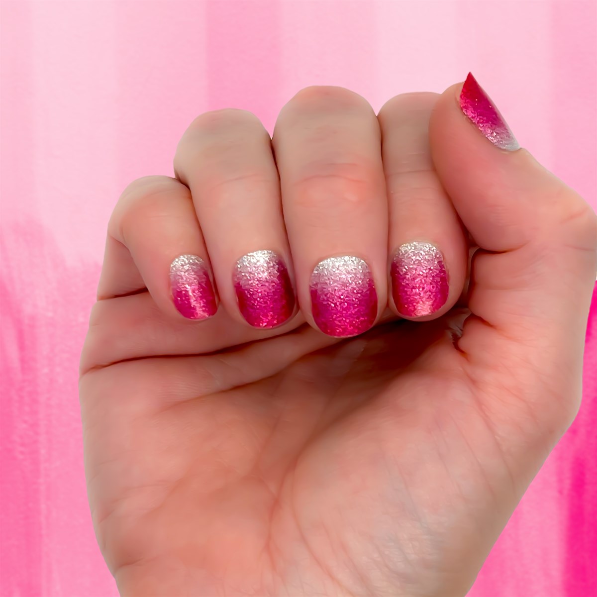 Add some magic to your manicure with our Nail Wrap in Love Potion! These sparkly wraps fade from silver to pink, giving your nails a stunning ombré effect. Perfect for adding a touch of love and sparkle to any outfit. (Warning: may cause an overload of compliments and envious stares.)