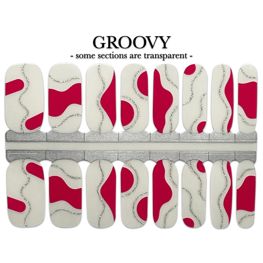 Get groovy with our 70's inspired Nail Wrap. Featuring small pink curved sections and silver lines on a transparent background. Groovy will add a playful and retro touch to your look. Spread love with these nails.