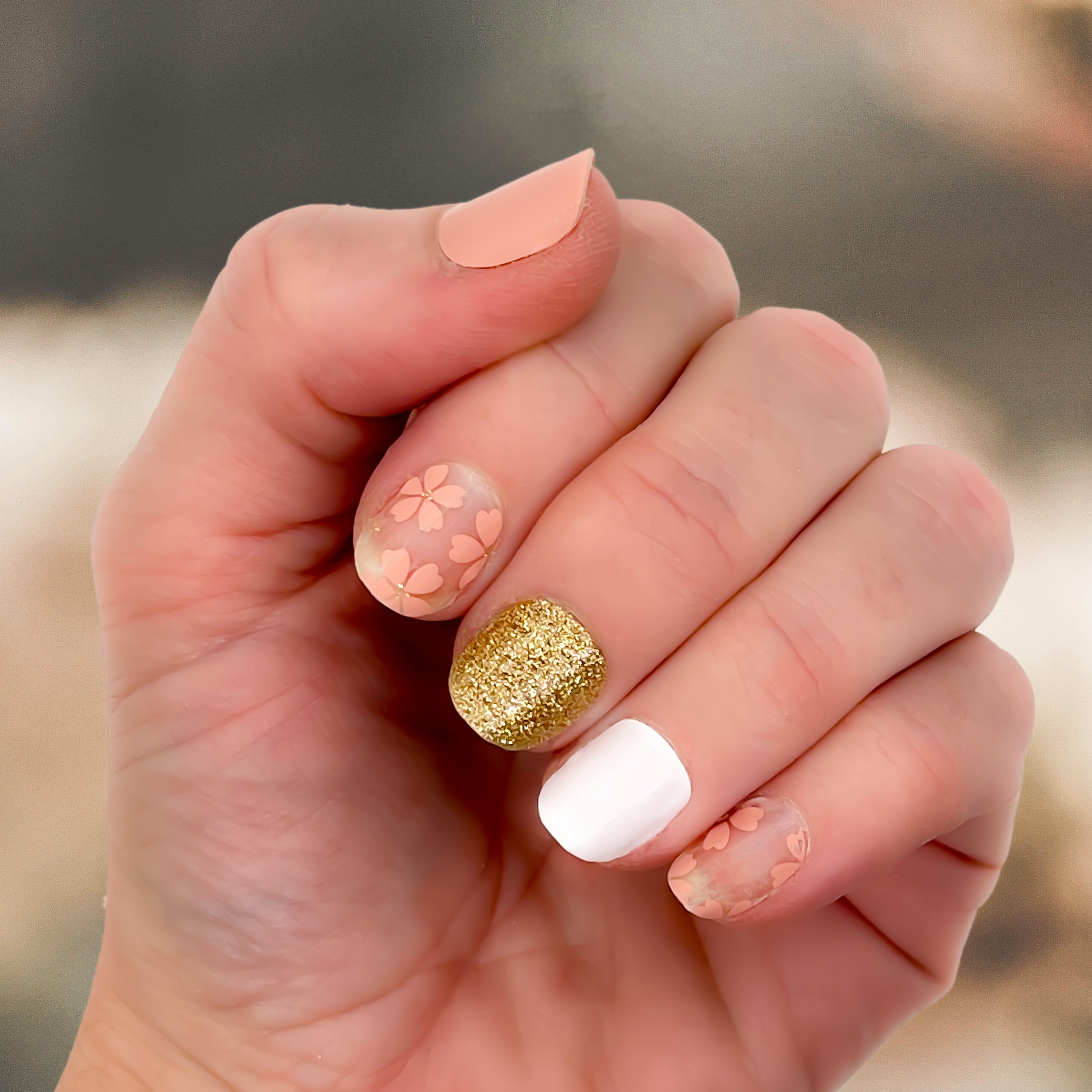 Embellish your fingertips with this stunning nail wrap. Transparent sections are accented with pink floral patterns and gold embellishments, while the solid gold glitter, white and pink wraps turn any manicure into a work of art. Give yourself the look of luxury and be sure to make your nails stand out!