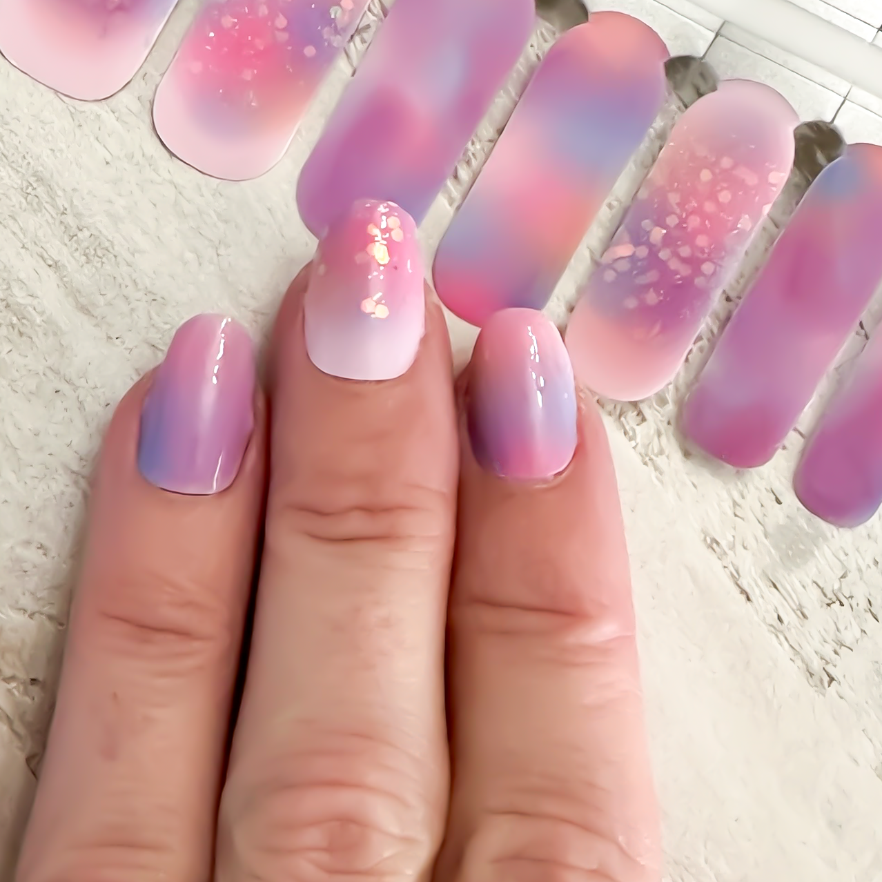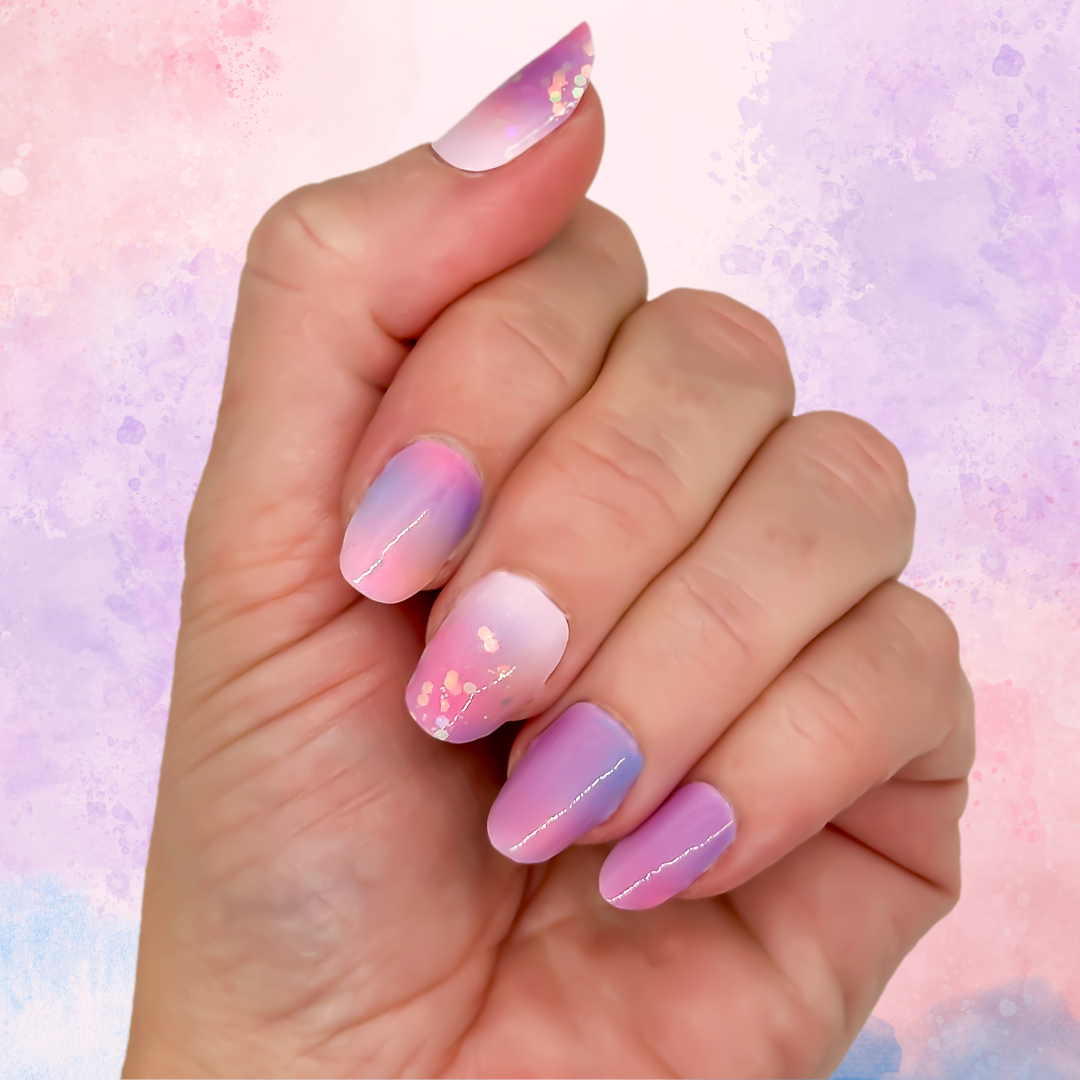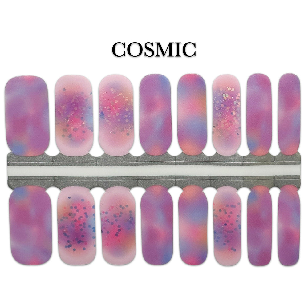 Experience out-of-this-world nails with our Cosmic Nail Wrap! The watercolor effect in vibrant pinks, purples, and blues is accentuated by playful glitter, creating a unique look.