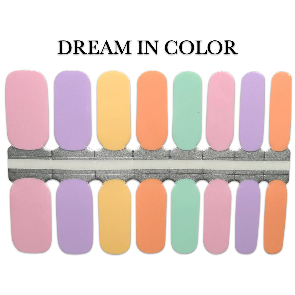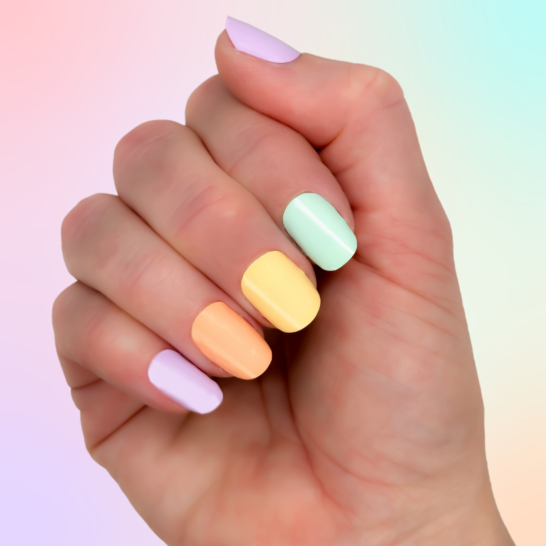 Transform your nails into a dreamy canvas filled with color! Featuring solid strips of pastel pink, purple, orange, and green, this nail wrap will add a touch of playful vibrancy to your look. Express yourself with every stroke of color.
