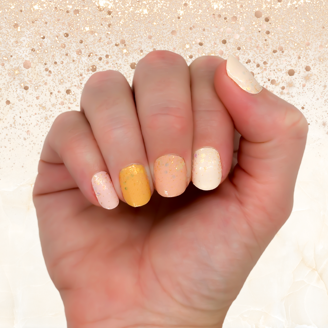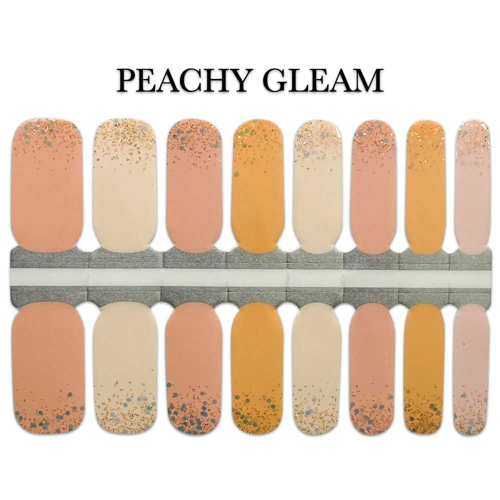 Indulge in a dreamy nail look with Peachy Gleam. Featuring neutral pinks, oranges, and cream colors, along with a touch of glitter, these wraps will add a touch of shimmer and sophistication to your nails. Elevate your everyday style with ease. Get yours today!