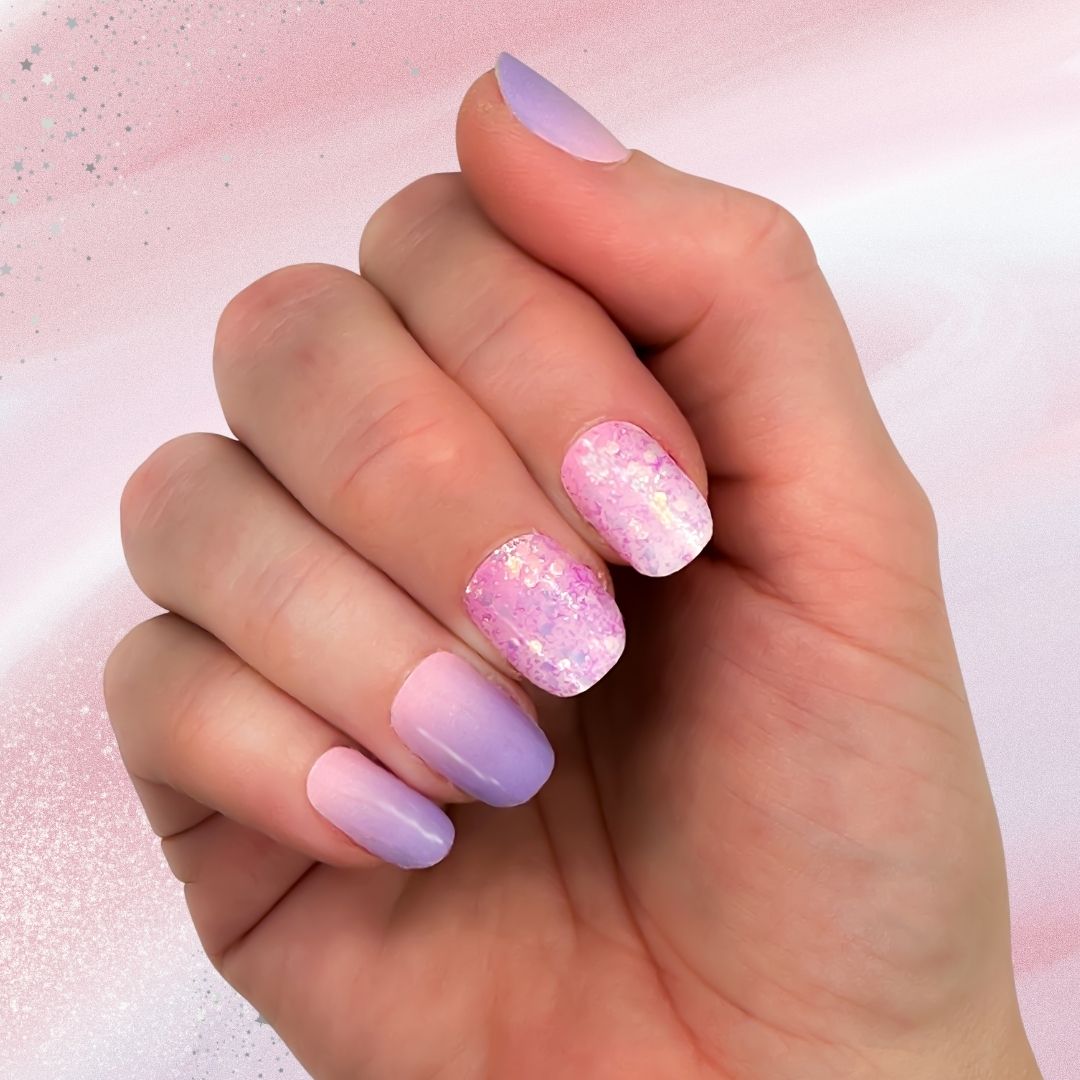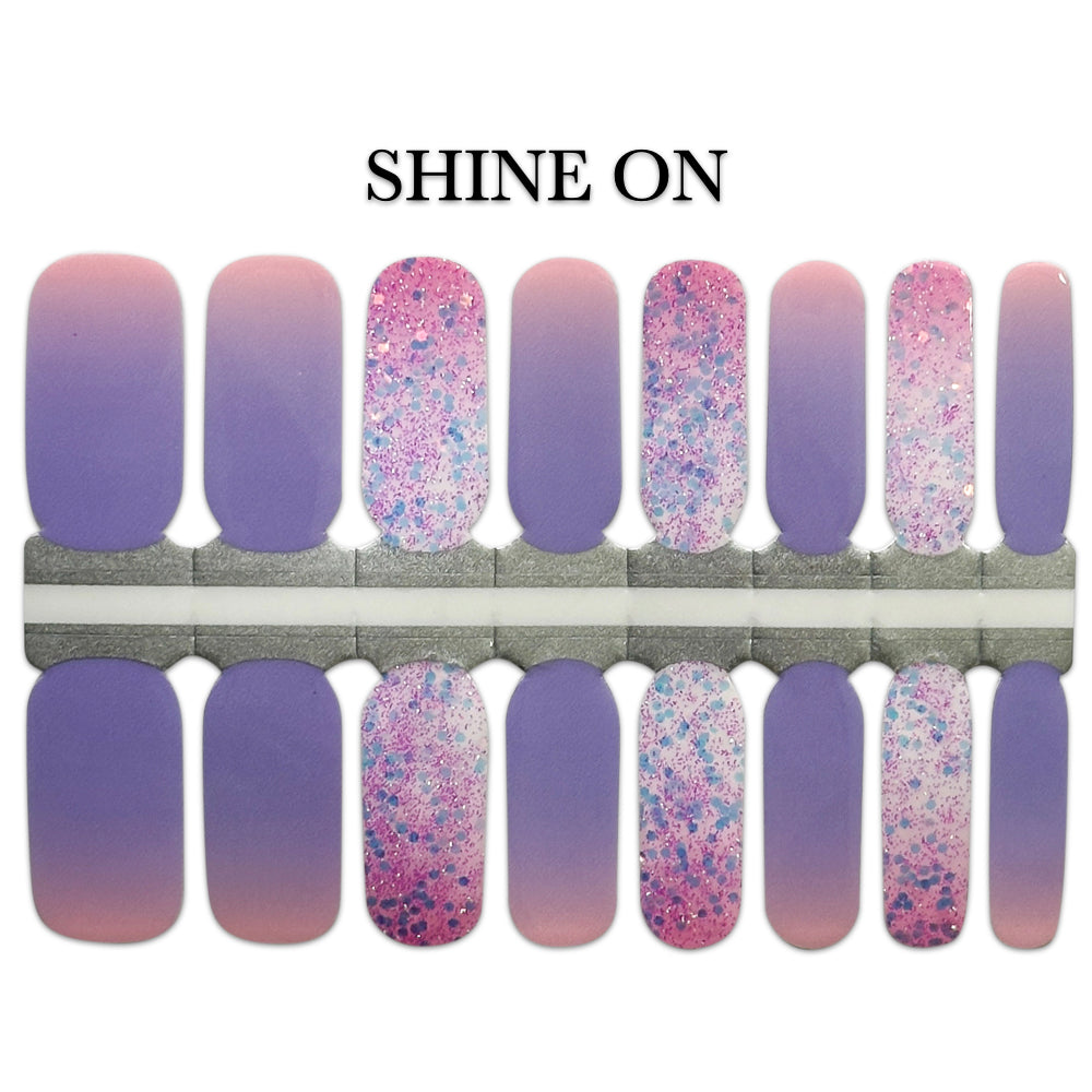 Transform your nails into a dazzling display with our Nail Wrap - Shine On! Featuring a stunning ombré of pink and purple, and a touch of sparkle, your nails will shine bright and turn heads wherever you go.