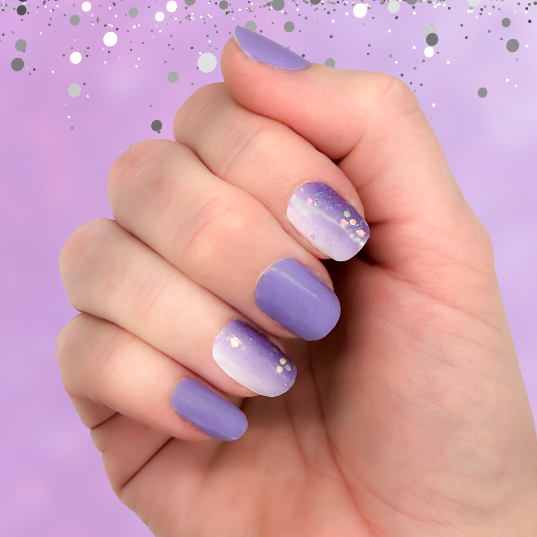 It's Time to Shine! These purple wraps feature a stunning white to purple ombré effect, accented with glitter for an extra touch of glamour. Embrace your inner diva and let your nails shine bright!