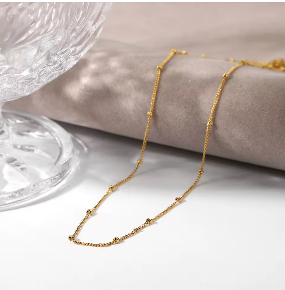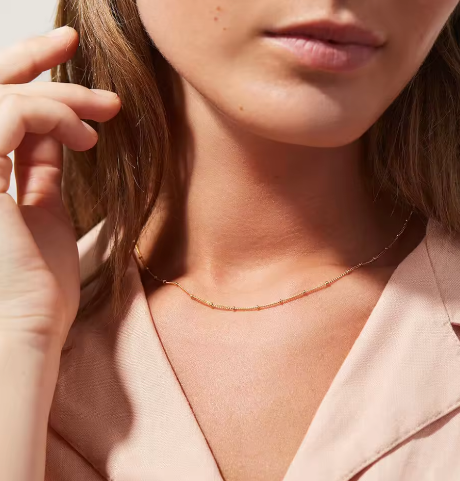 This necklace features tiny gold beads and a delicate design. The adjustable extender lets you mix and match lengths for a fun, customizable touch to any outfit.