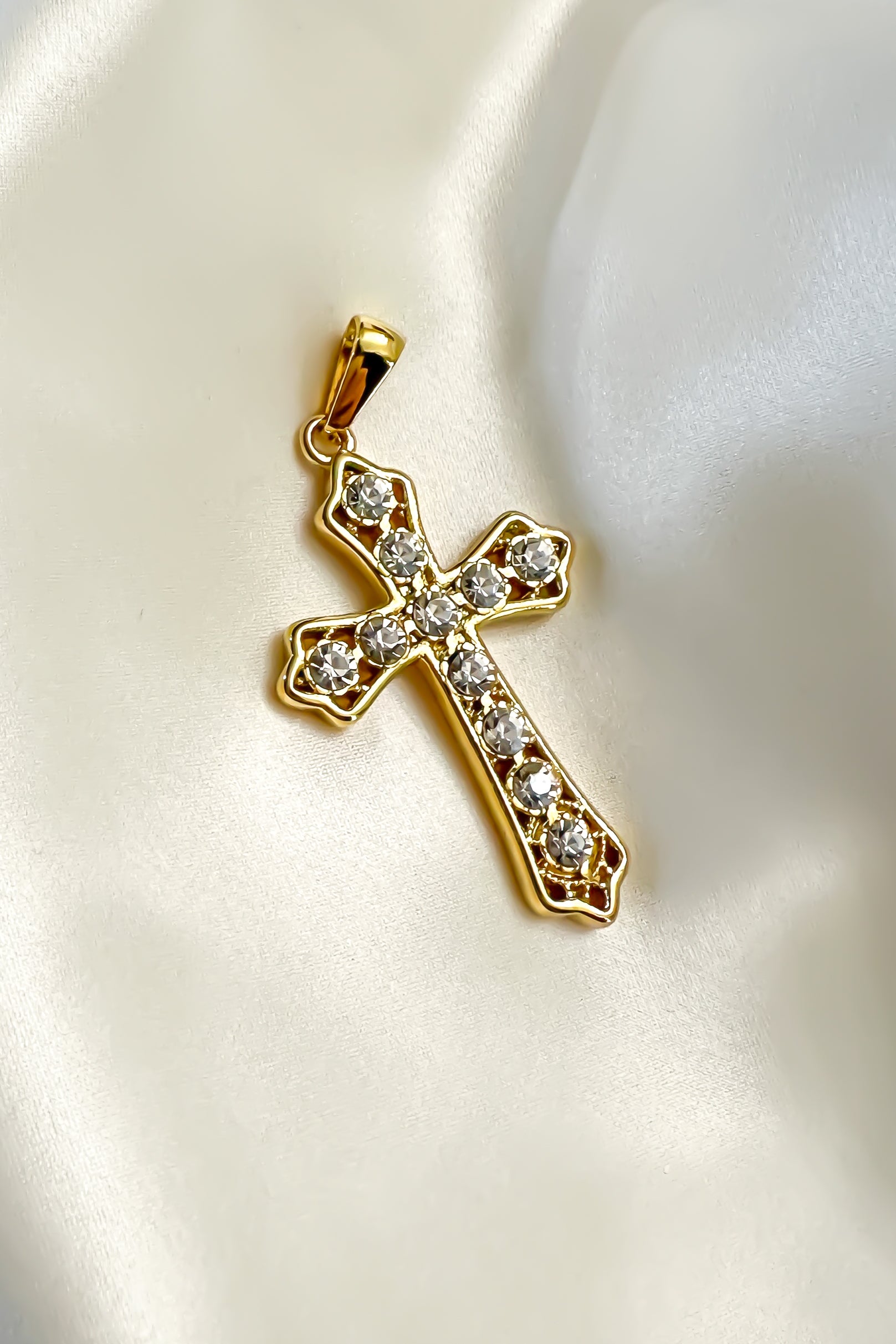 Classic and radiant, our Crystal Cross Charm adds timeless sparkle to any charm stack. This charm features a gold-framed cross design adorned with brilliant-cut crystals that catch the light beautifully from every angle. The slightly flared tips and intricate frame detail give it a vintage-inspired silhouette, making it a meaningful piece you’ll reach for again and again. Perfect for everyday wear or special occasions, this charm blends spiritual symbolism with elegant style.