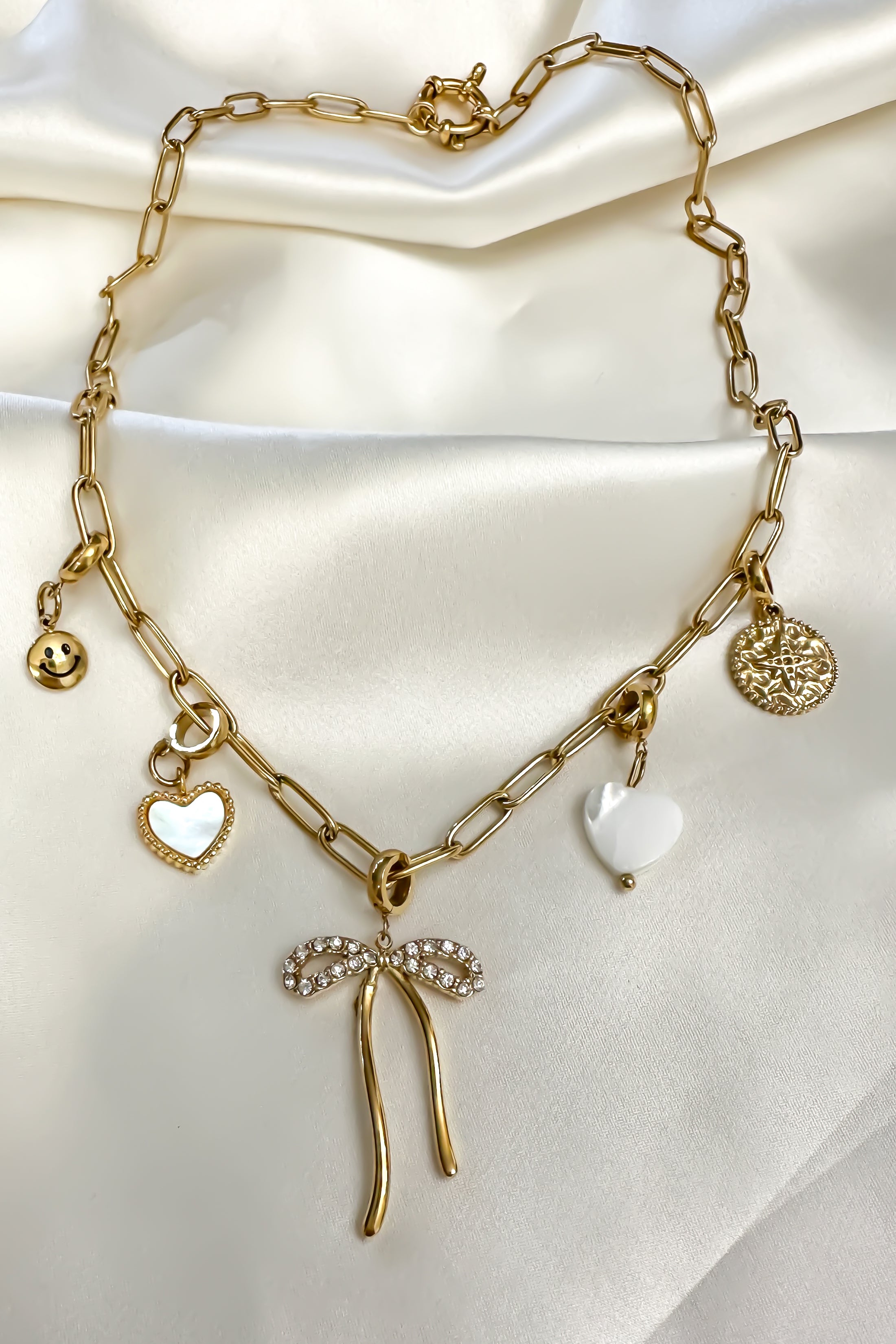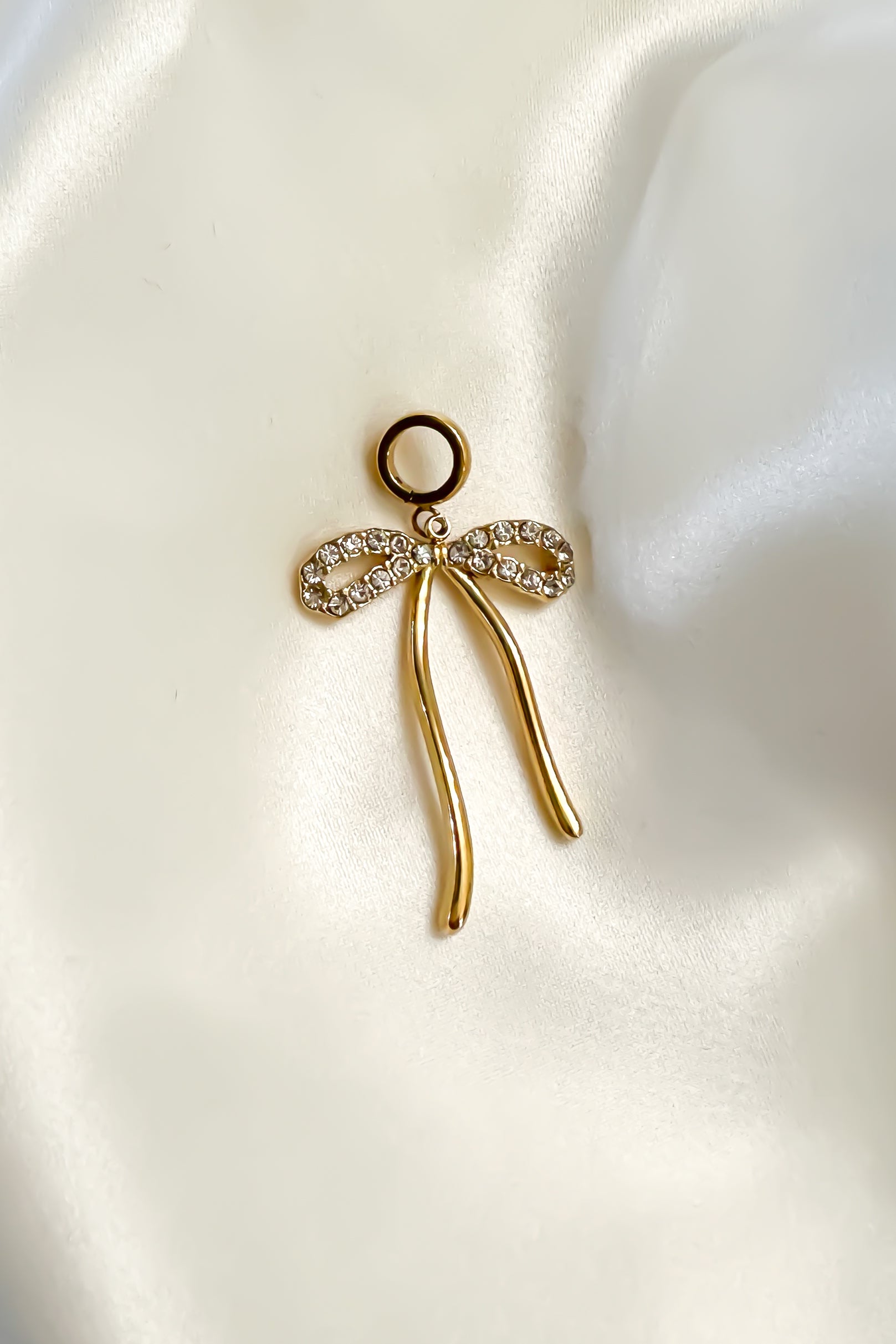 Charming, feminine, and a little bit sparkly — our Crystal Ribbon Bow Charm is the perfect accent for bow lovers and trend seekers. This charm features a delicate long-tail ribbon silhouette with crystal-studded loops that add just the right amount of shimmer. Featuring a polished gold stainless steel finish, it pairs beautifully with initials, hearts, and florals for a chic, curated stack.