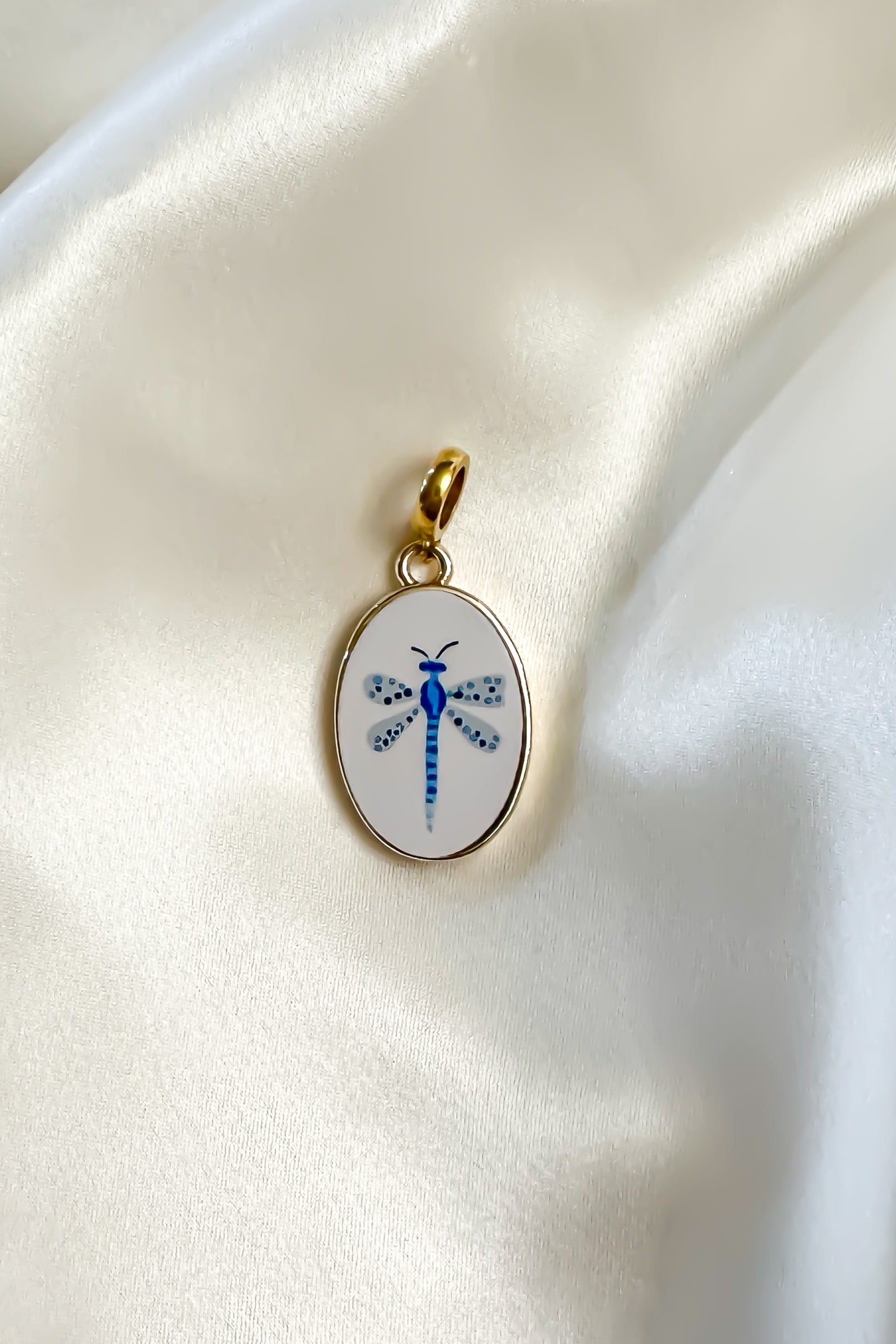 Whimsical and symbolic, our Blue Dragonfly Porcelain Charm features a hand-painted dragonfly centered on a glossy oval porcelain base. The rich blue wings add a touch of artistry and movement, while the polished gold frame enhances the charm's elegance. Dragonflies often represent transformation, joy, and light—making this piece both stylish and meaningful for everyday wear.