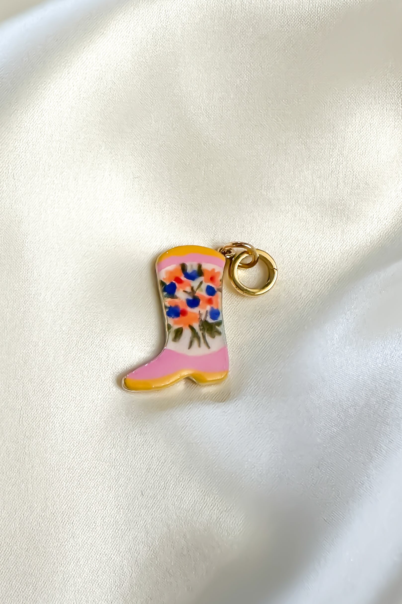 Western charm meets feminine style in our Pink Floral Boot Porcelain Charm. This adorable boot-shaped charm features a hand-painted pink finish adorned with delicate floral details that add a sweet, whimsical touch. The polished gold frame gives it a refined edge, making it a standout piece that’s both fun and stylish. Whether you’re a country girl at heart or just love unique statement charms, this one is sure to spark compliments.