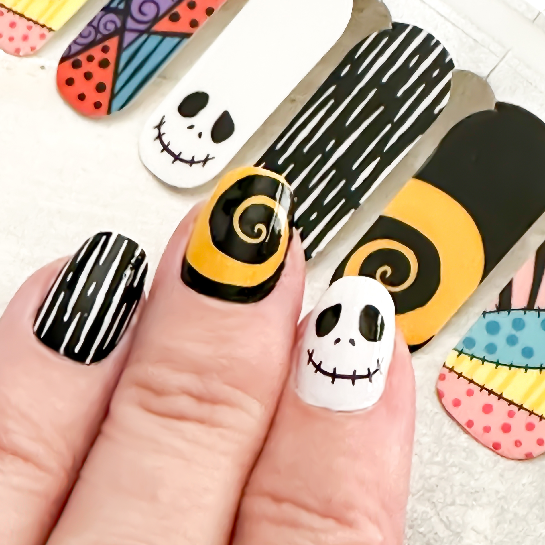 Transform your nails into a Halloween fantasy with our Nail Wrap - Jack & Sally. Inspired by Nightmare before Christmas, these vibrant nail wraps feature a smiley skeleton and patchwork fabric design. Get ready to turn heads with your fun and playful nails!