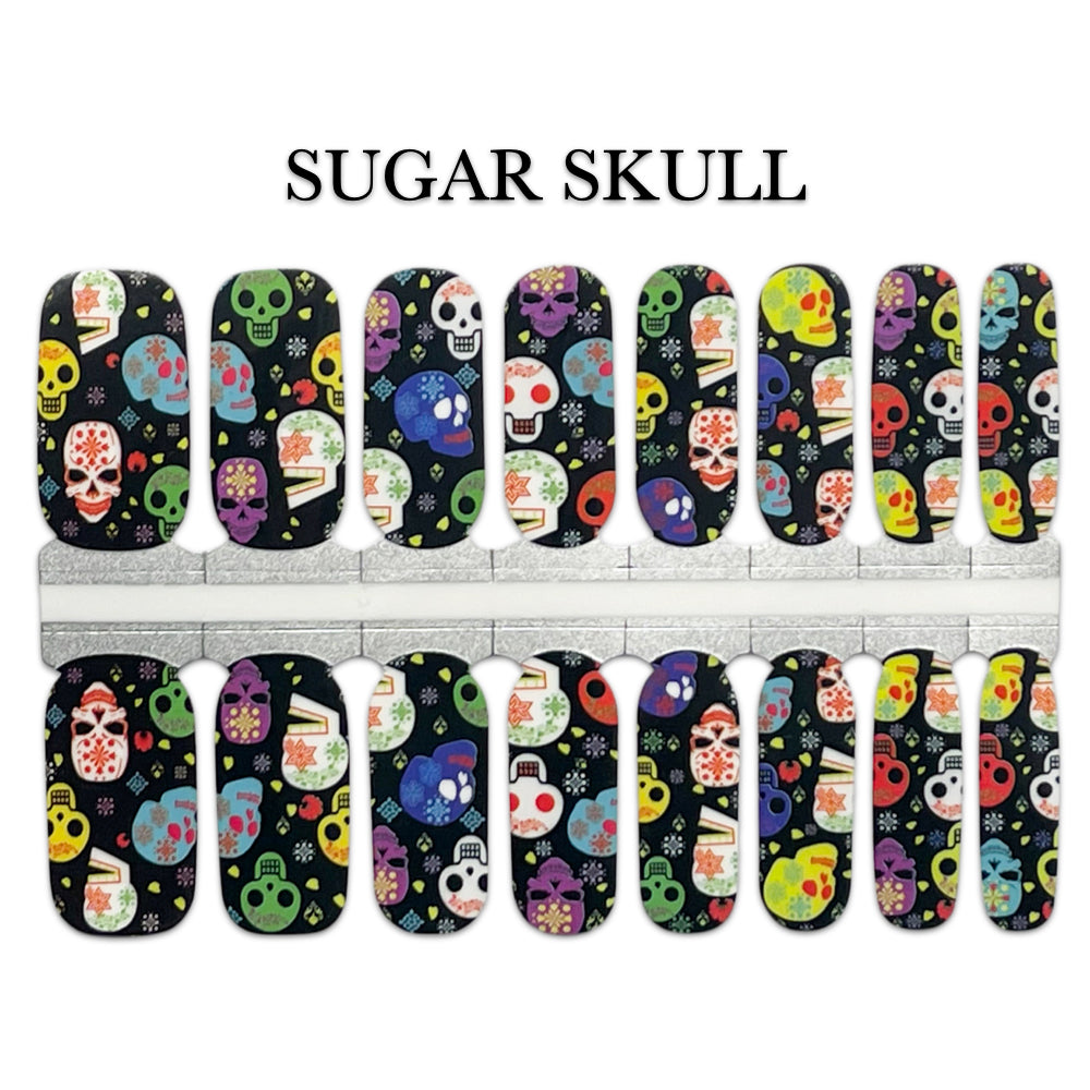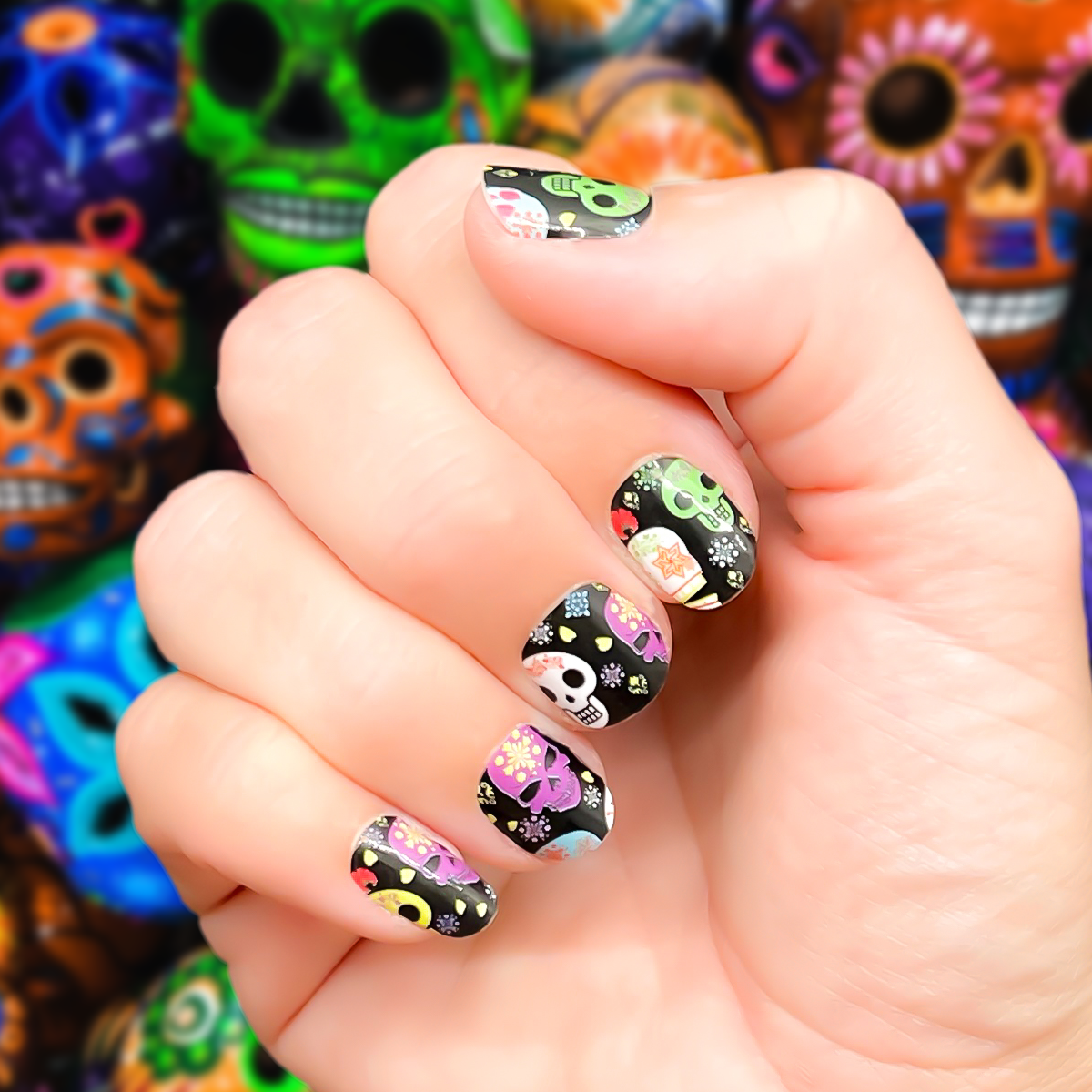 Fancy a bit of nail art this Halloween? Apply these Sugar Skull Nail Wraps for vibrant, Day of the Dead-inspired flair! Each wrap features colorful Calavera skulls on a black background, so your fingertips will be striking without any fuss. Get ready to show off your artful look!