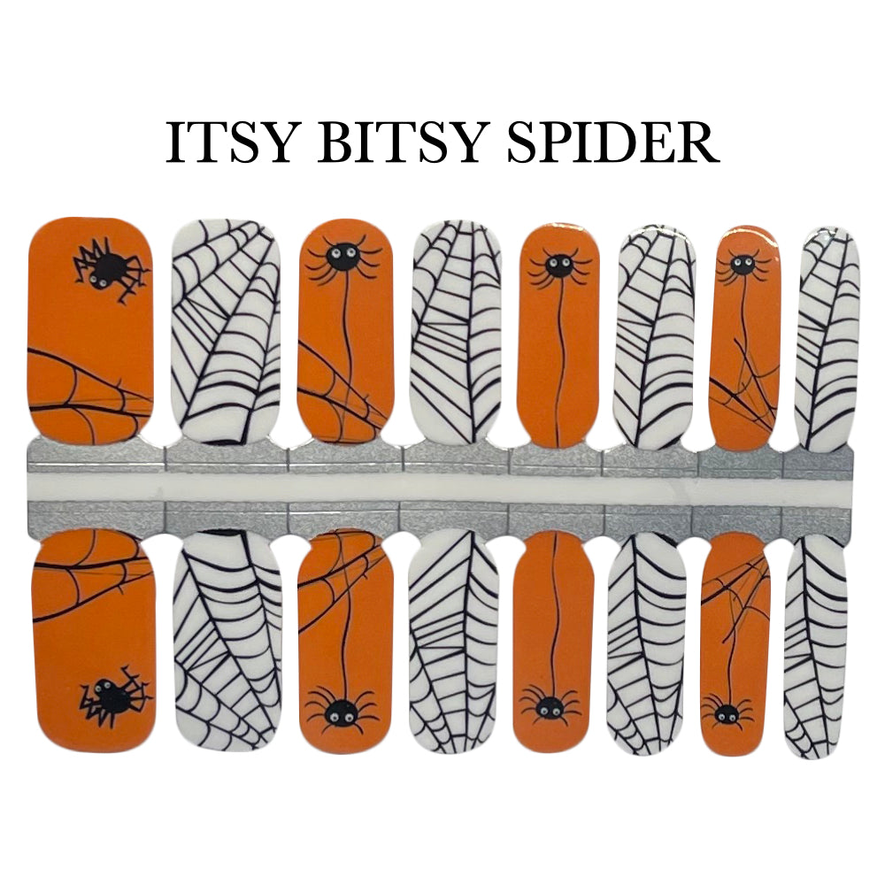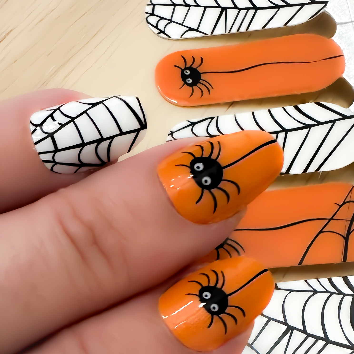 The orange and white nails are accentuated by black spiders hanging from their webs. Perfect for Halloween or adding some edge to your everyday look. Impress and inspire with these unique nail wraps.