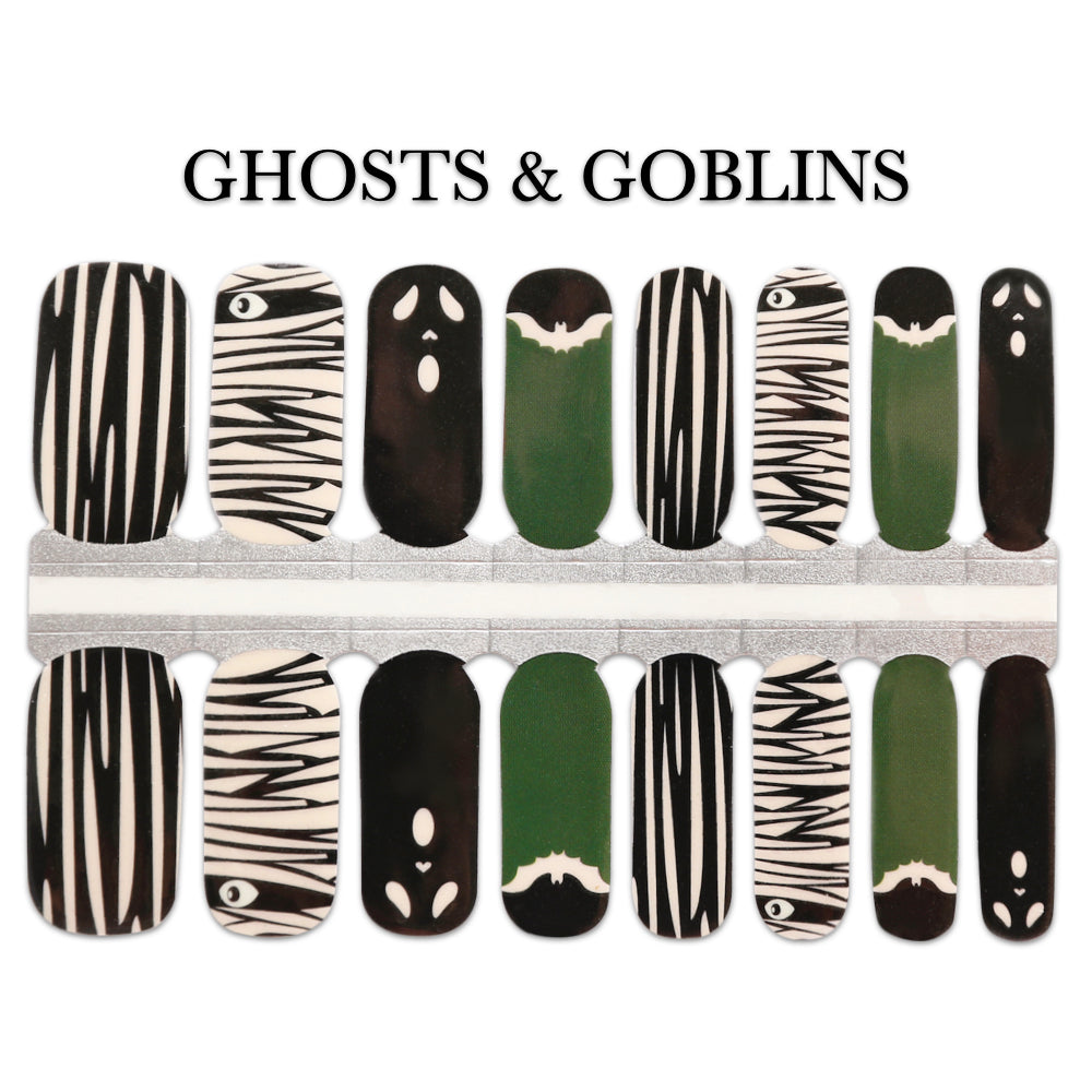 Get into the spooky spirit with our Ghosts & Goblins nail wrap! Featuring mummy, ghost and bat designs in classic black and white, you'll be the life of the party with a look to die for!