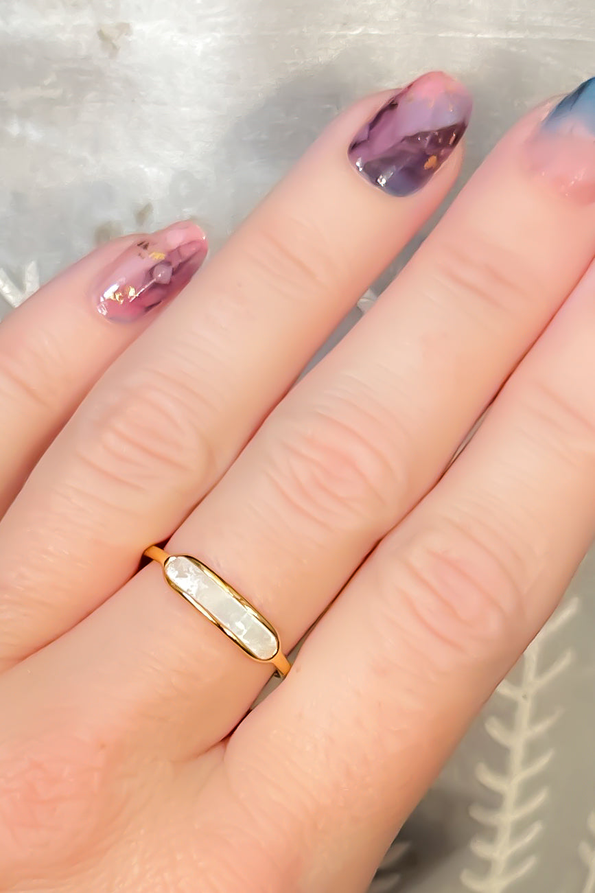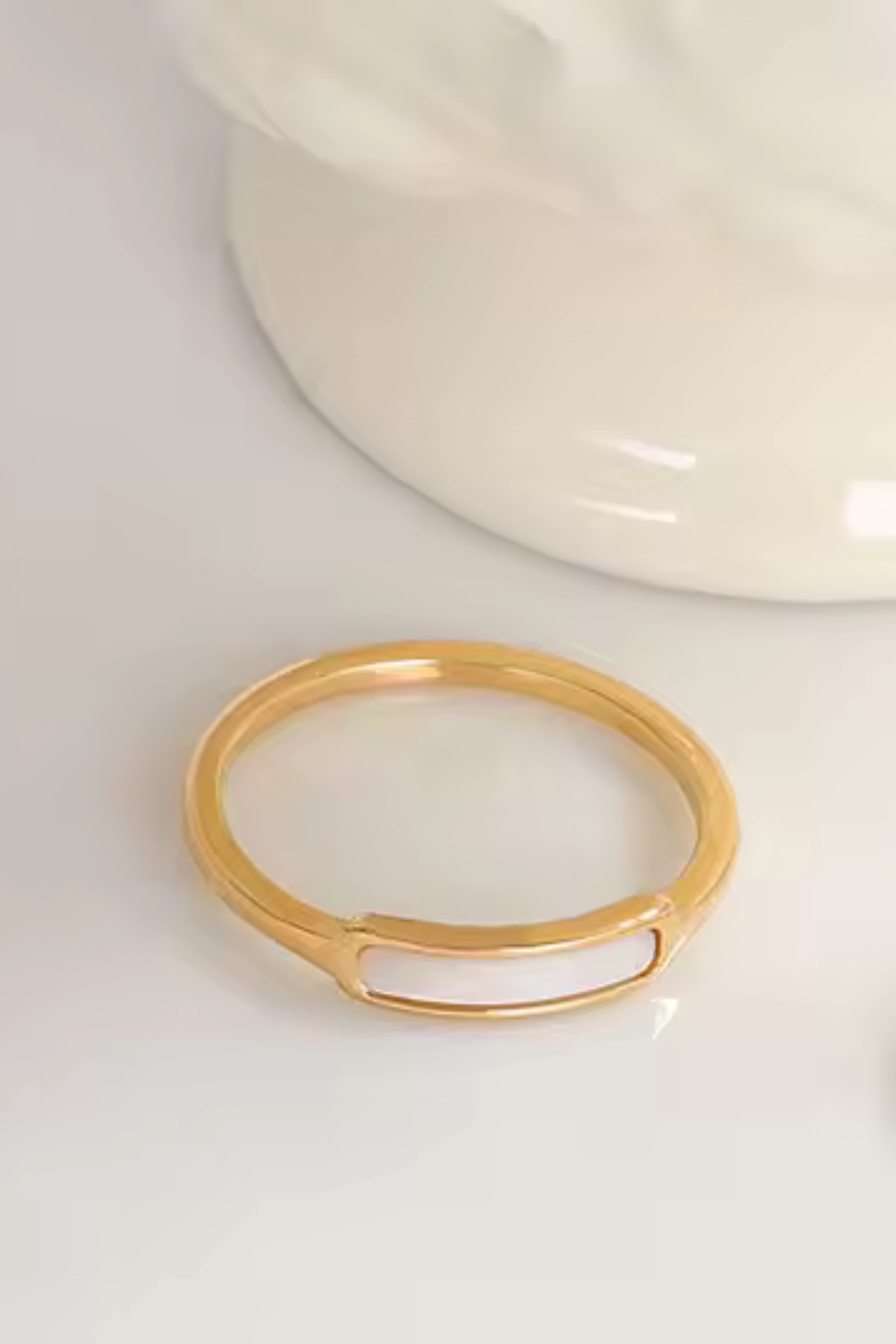 This sleek and stylish band features a mother of pearl nacre bar, adding a touch of sophistication to any look. Wear it alone for a fancy, minimalist look, or stack it with other rings for a modern twist. Up your ring game now!